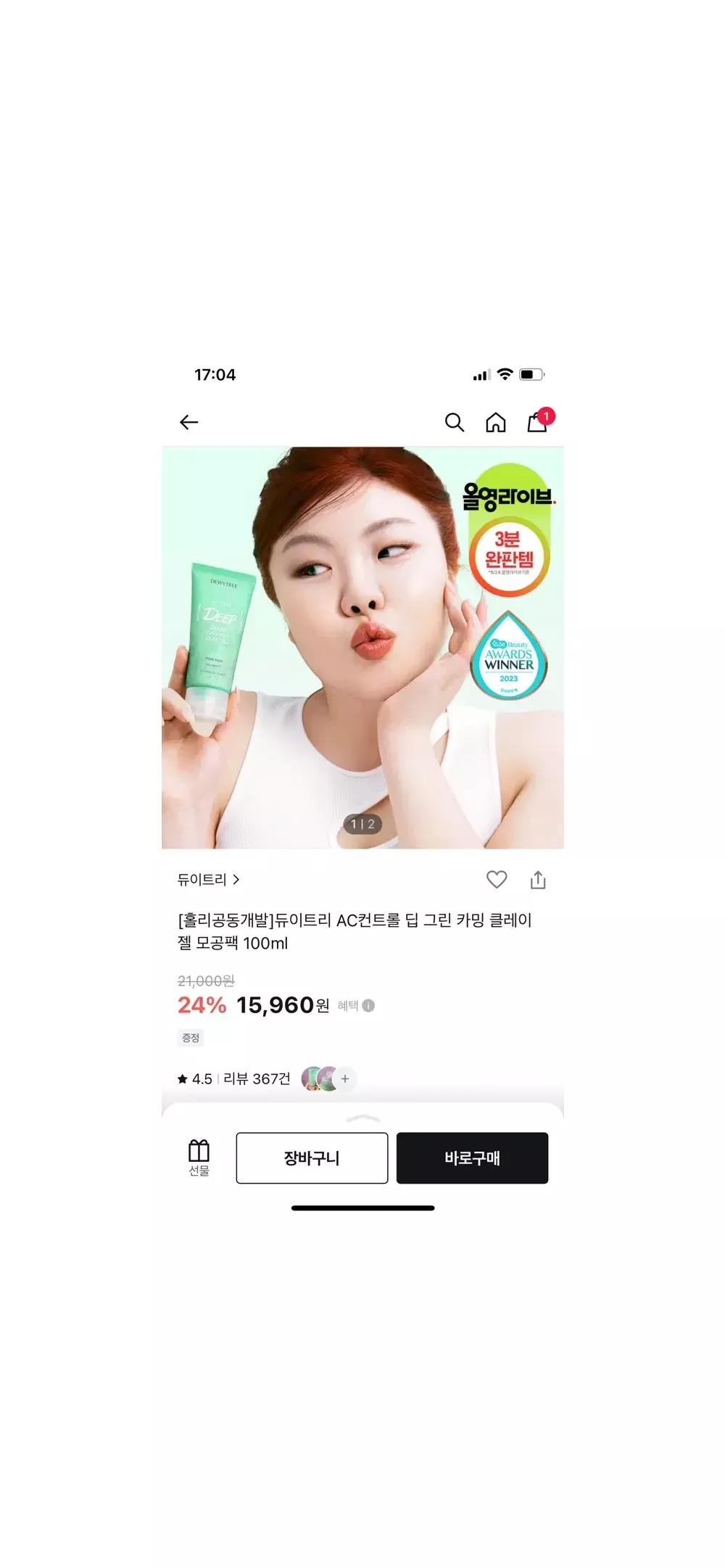 듀이트리 AC 컨트롤 딥 그린 카밍 클레이 젤 모공팩 100ml > 뷰티
