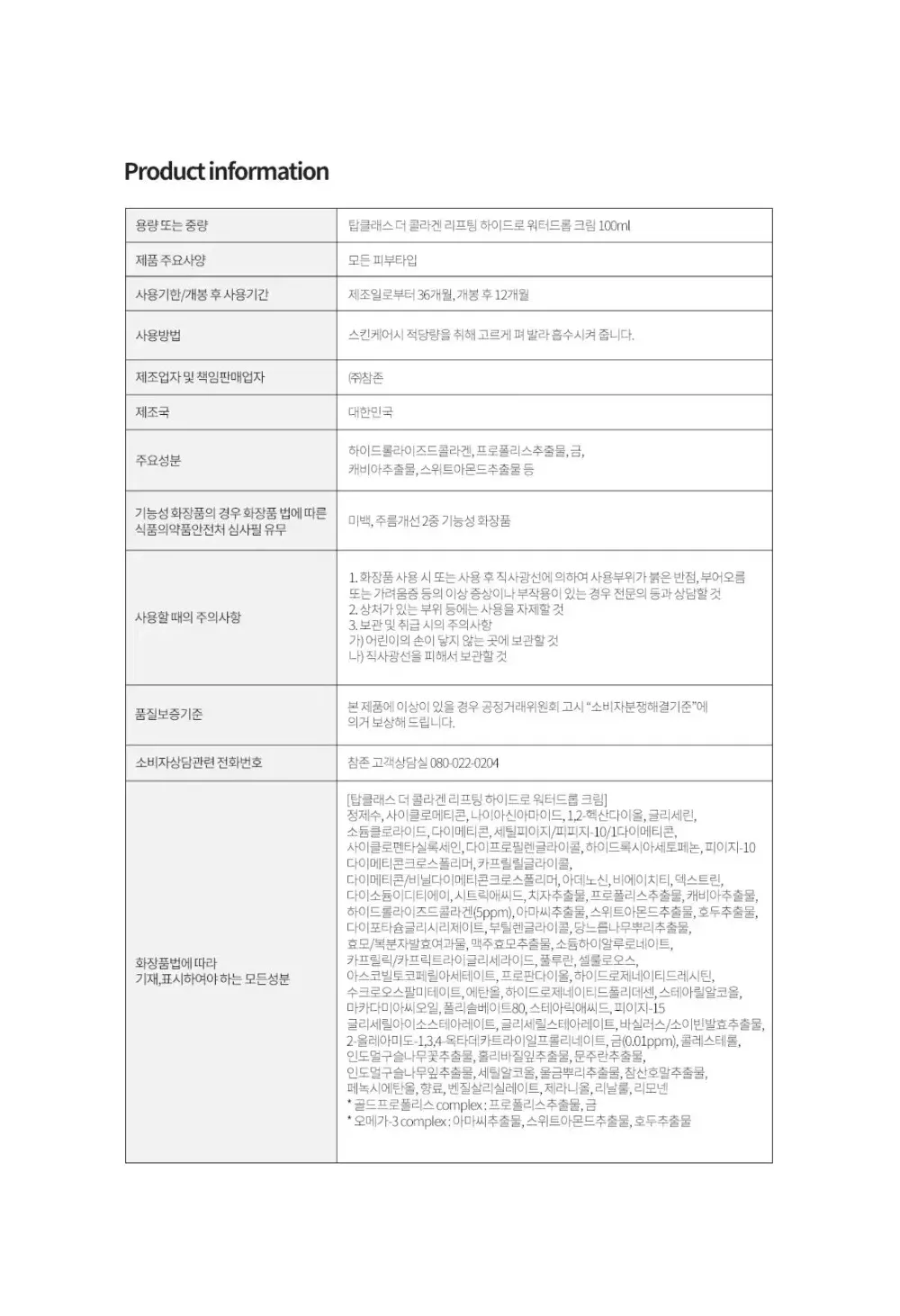 당일발송 참존 탑클래스 더 콜라겐 리프팅 하이드로 워터드롭 크림 100ml (미백.주름개선 2중 기능성 화장품) 콜라겐의 탄력감에 더하여 피부를 오랜시간 촉촉하게 케어해주는 탱글촉촉 수분크림 [효능ㆍ효과] 피부의 미백, 피부의 주름개선 1개구매시 7,200원 2개구매시 13,000원