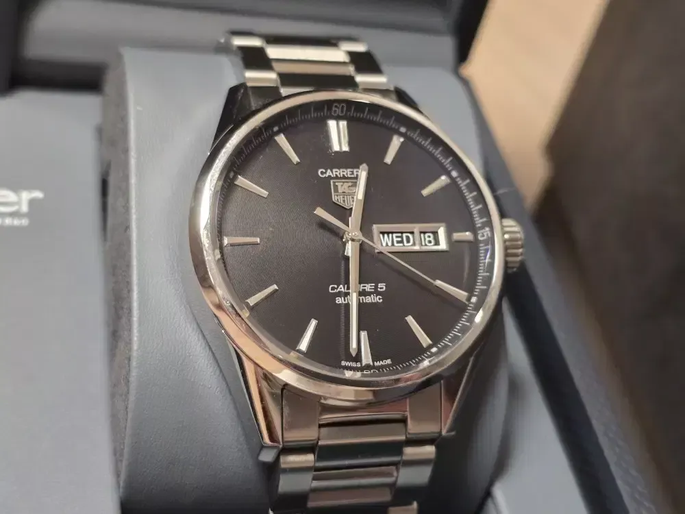 태그호이어 까레라 칼리버5 데이 데이트 41mm 오토 검판 입니다 2020년 7월 국내 스탬핑 으로 시계가 여러개라 돌려 차서 약간의 생활스크레치 외엔 퍼펙트한 상태 입니다 잠실 입니다 010 칠오사이 7112