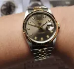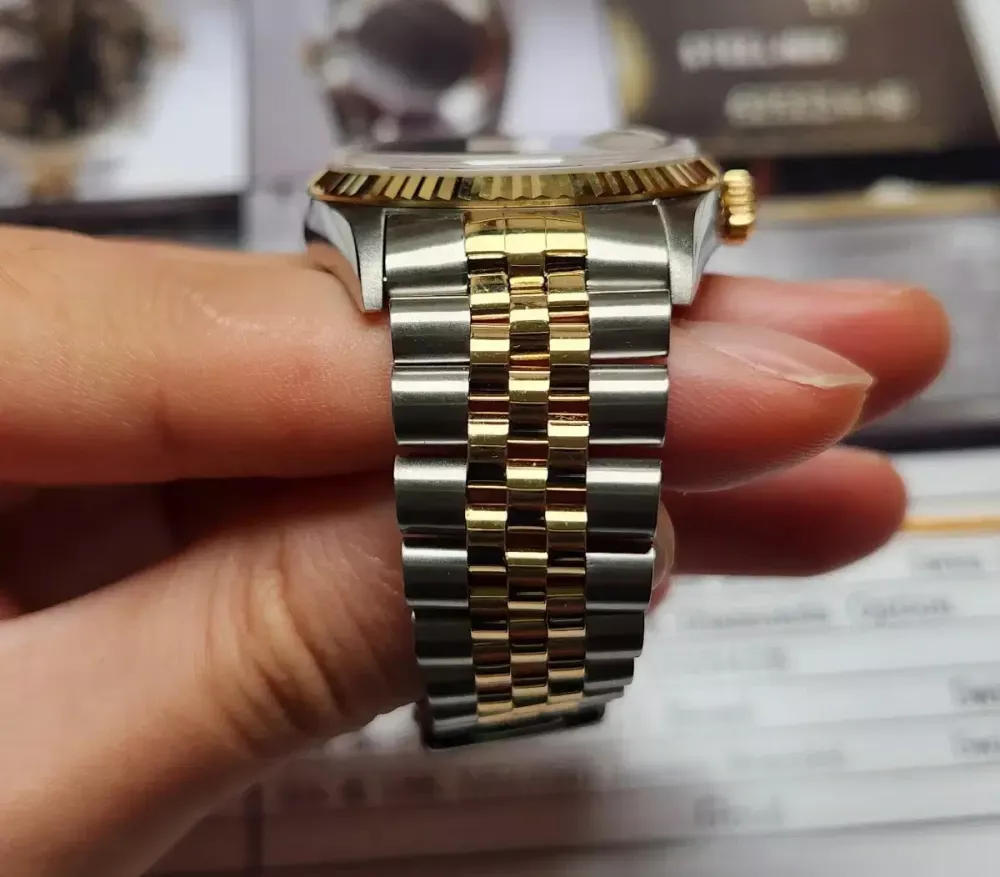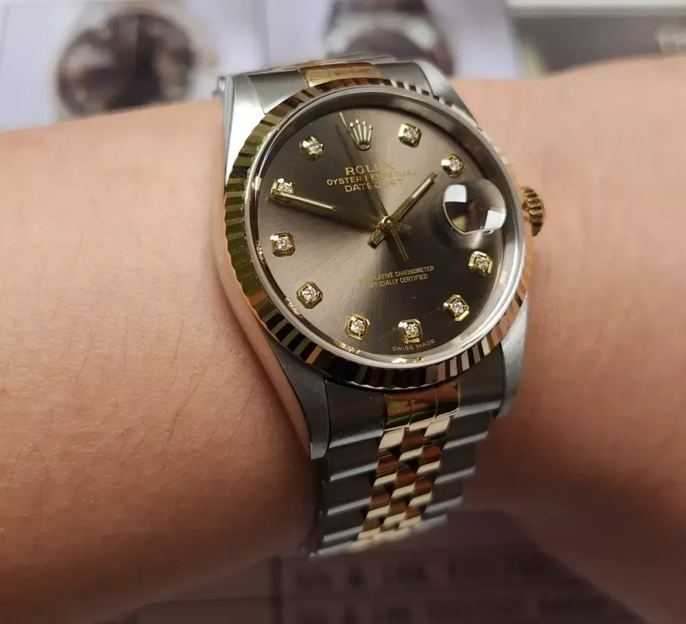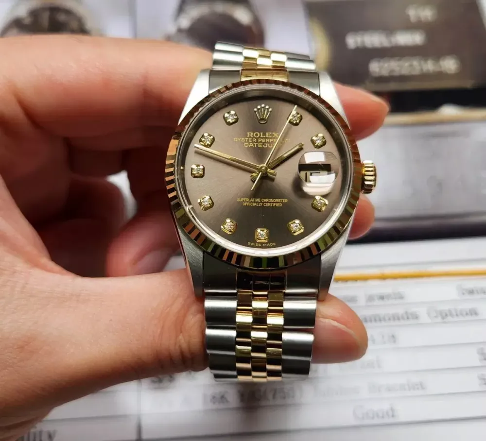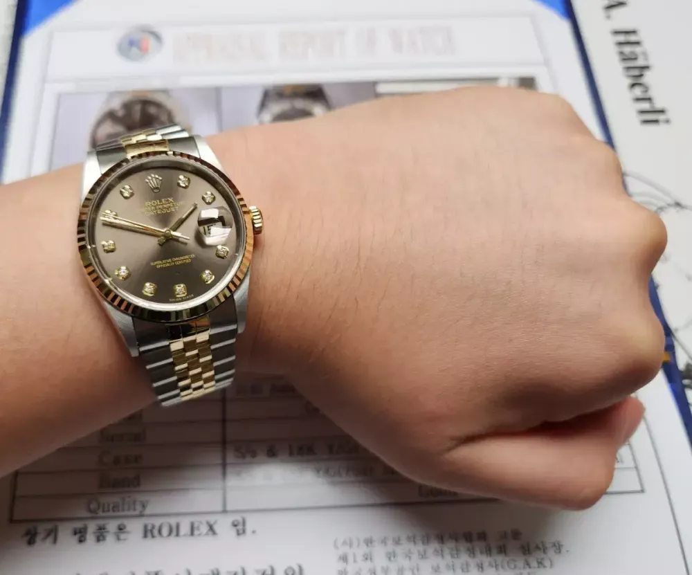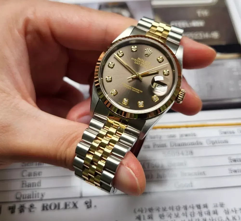 ●아래 내용 꼭 읽고 문의주세요● - '교환', '업자 문의' 사절. 상식밖 거래 및 비매너, 사적 요청, 의미없는 대화 X - 연락 후 고민이 아닌, 고민 다 끝나면 연락부탁드립니다 - 협의없는 임의 카드 결제시 취소됩니다. 아무런 대화없이 카드결제할 경우, 거래 진행 불가함을 알려드립니다 - 제 사진을 도용해 터무니없는 가격에 올려놓는 도용 사기글들에 주의하세요 - 구매 전 상점 정책 필독 _________________________________ 롤렉스 데이저스트 16233 18K콤비 초코판 10P다이아 (감정서포함) 롤렉스 16233. S단위로 연식 좋고 양도전 큰 비용 들여서 아주 세련된 초코판 + 10P 천연다이아 세팅까지 완료한 16233입니다. 당연히 일반 16233과 큰 차이가 있고 실물에서부터 큰 차이거 있습니다. 추가적으로 전체 최고급 폴리싱, 무브먼트 점검까지 모두 완료해 바로 착용하시면 되며, 브레이슬릿과 베젤, 용두 노란부분 모두 18k금입니다. 별도로 비용주고 감정서까지 떼놨으니 안심하셔도 되며, 긴말 필요없이 실물보고 판단하세요. 직거래 서울 군자역입니다.
