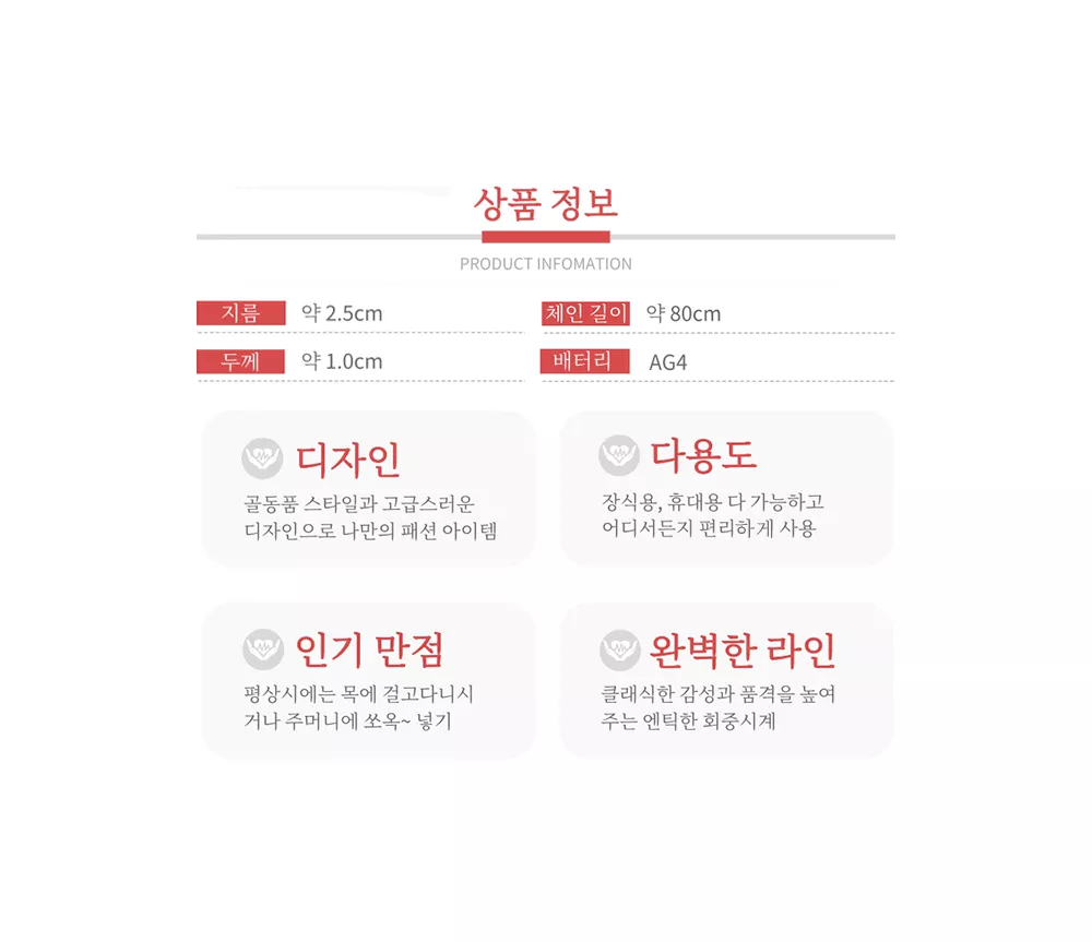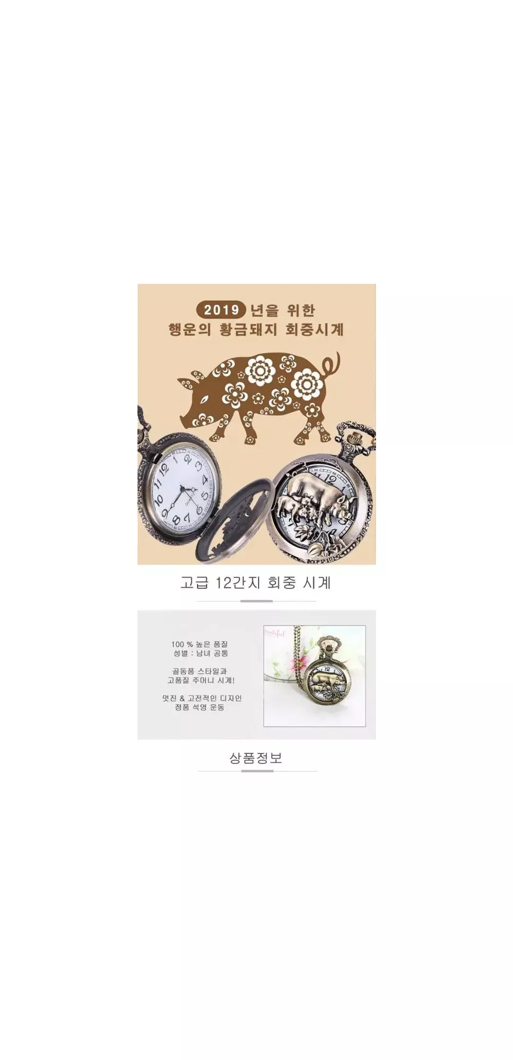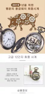 새 돼지띠 수입 정품 회중 시계 12간지 동물 수호 기념 황금 생일 기념 선물 소장용 멀티 복 앤틱 목걸이 필수 12지신 음력 양력 운세 주기 디자인 케이스 다이얼 바늘 버튼 배터리 시간 포켓 장식 클래식 기능 액세서리 대체 디지털 고급 선물 유리 스승의날 어버이날 *제품 1개 발송됩니다.* *회중시계 구매 시, 목걸이줄 함께 드립니다 *허리줄 체인은 별도 구매입니다 돼지띠가 그려져 있는 회중 시계 입니다. 돼지띠인 분들에게 선물하기 좋습니다. 선물용 시계 케이스도 드립니다. 지름 약 45 mm 두께 약 15 mm 체인총길이 약 80 cm New Pig imported genuine pocket watch 12 zodiac animals guardian commemorative gold birthday commemorative gift collection multi-fortune antique necklace essential 12 zodiac signs lunar solar calendar fortune cycle design case dial needle button battery time pocket decoration classic function accessory alternative digital luxury gift glass Teacher's Day Parent's Day *1 product will be shipped.* *When purchasing a pocket watch, a necklace string will be provided together *The waist chain is purchased separately This is a pocket watch with a pig zodiac sign drawn on it. It is a good gift for those born in the year of the pig. We also provide a gift watch case. Diameter approx. 45 mm Thickness approx. 15 mm Total chain length approx. 80 cm