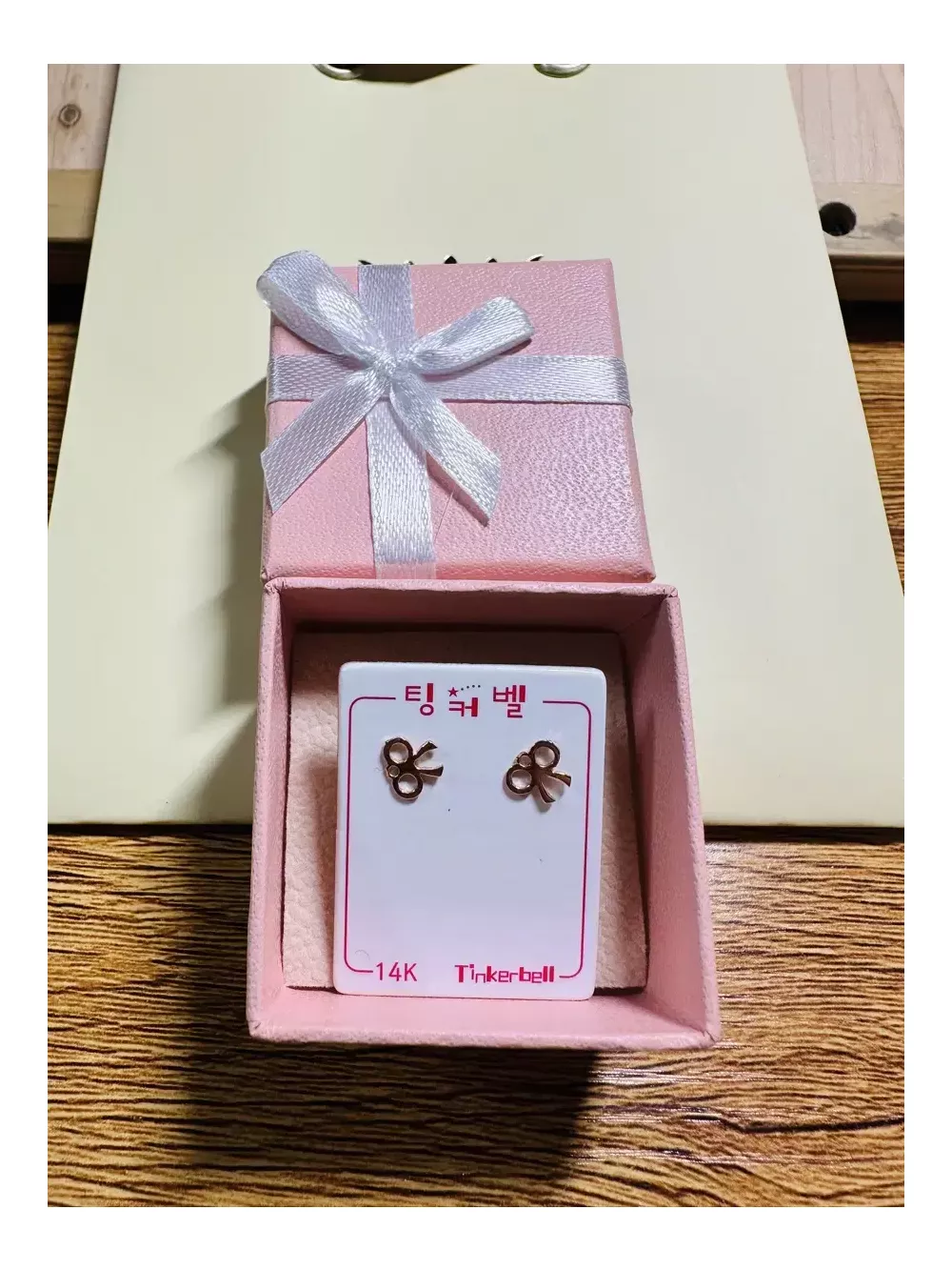 팅커벨 14K 리본 귀걸이 미착용 새상품입니다! 선물상자,쇼핑백이 있어서 선물하시기에 좋아요~ 중고거래이니 미리 확인하시고, 환불 불가합니다~