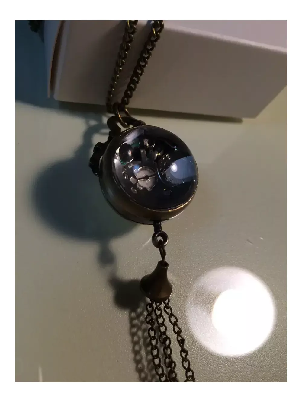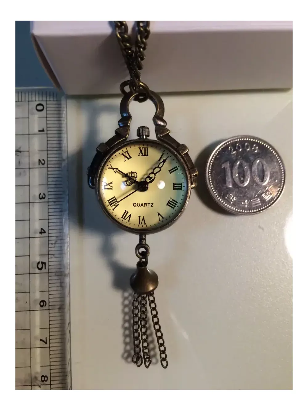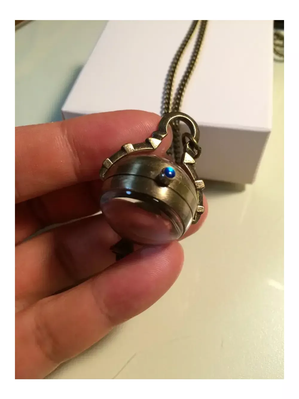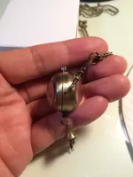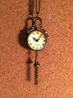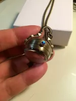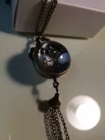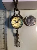 앤틱한 예쁜 목걸이시계입니다~! 투명구슬 속에 시계가 있고 뒷면엔 부속장치가 보여요. 에메랄드 빛이 감도는 용두를 살작 뽑으면 시간을 맞추시실수 있으며 다시 용두를 누르셔야 시계가 작동해요. 미사용 신품으로 배터리도 내장되어 있지만 보관기간중에 소모되어 새 배터리로 교체가 필요합니다. 줄길이는 40(x2)cm 이며 길이는 손쉽게 줄이실수 있어요~! 시계 뒷면(유리반구)이 열리므로 다이소에서 천원에 4개를 파는 시계 배터리(377)로 쉽게 교체 가능합니다. 앞뒷면 스크래치 보호용 투명필름이 붙어있으니 제거후 사용하세요~ 배송료는 GS25 반값택배기준입니다. 일반택배를 원하시면 배송료 2000원을 추가로 보내해시면 됩니다