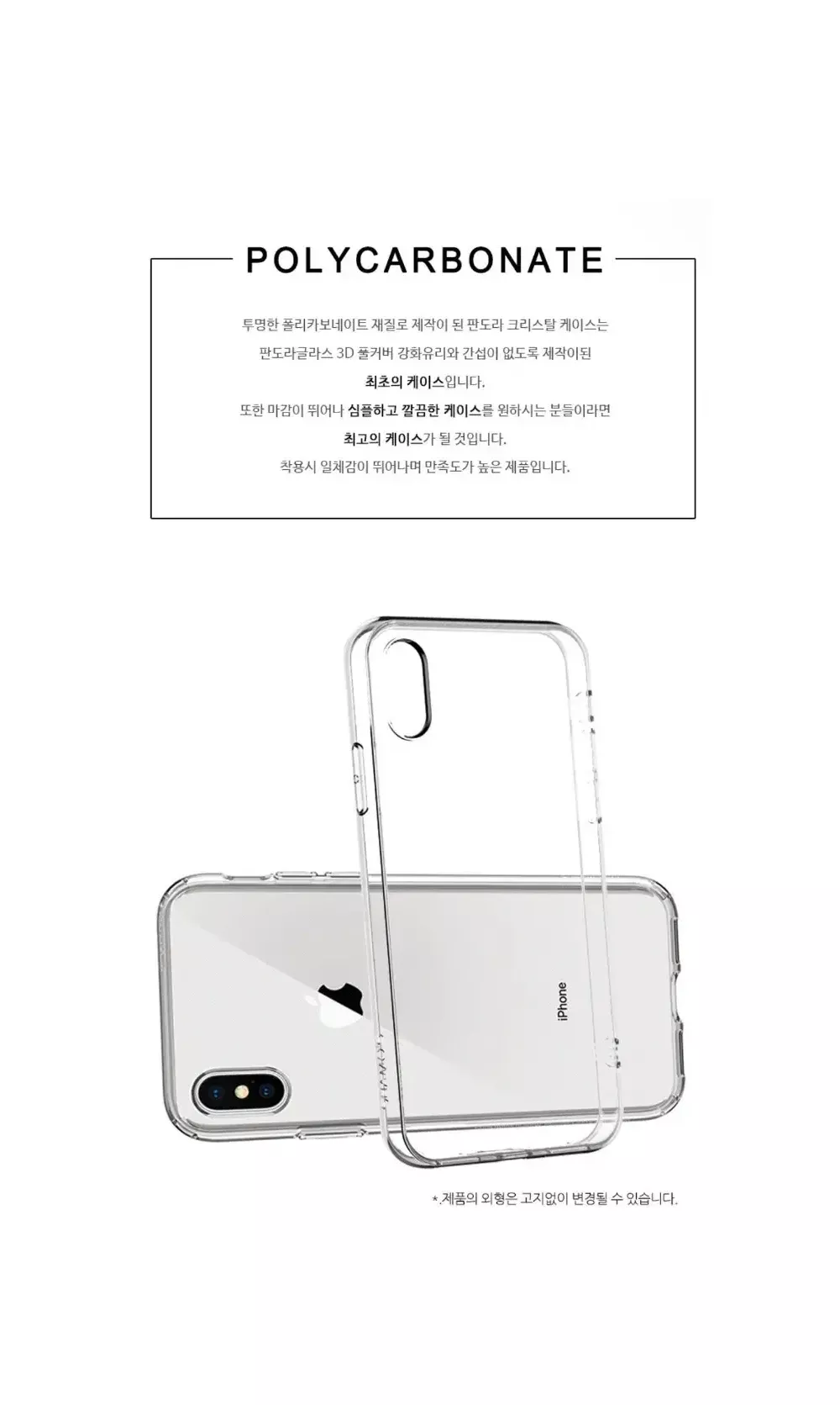 ■변색 없는 크리스탈 3D하드케이스■ ▪︎아이폰 전기종 보유 ▪︎0.8mm 슬림형으로, 낀듯 안낀듯 휴대폰 그대로의 아름다움을 지켜주는 케이스 ▪︎폴리카보네이트 소재로 변색 없이 내구성도 강한 케이스 ✔️번개페이 배송비 변경 및 합배송 등 문의는 번개톡 부탁드립니다. ✔️배송비 우편 900~원 / 준등기 2000원 / GS25반값택배 2100원 / 일반택배 3000원(제주산간+3) ?1만원 이상 *첫*구매 시 GS반값택배 ●1500원● ?1만원 이상 *재*구매 시 GS반값택배 ●1800원● ?1만원 이상 구매 시 *우편* 무료배송 [ 유리필름 배송 불가X] ?3만원 이상 구매 시 *일반택배* 무료배송 ■모든 유리필름은 파손으로 택배배송만 가능합니다 ⬇️ㅡㅡㅡㅡ휴대폰케이스ㅡㅡㅡ⬇️ ▪︎M1. 매머드 맥세이프 케이스(4500원)●(변색방지) ▪︎0.변색없는 3D 크리스탈 하드케이스(3900원)● ▪︎1.불사 매머드 케이스(1800원)● ▪︎2.불사 매머드 카드케이스(2900원)●(변색방지) ▪︎3.불사 매머드 하드케이스(3900원)●(변색방지) ▪︎4.불사 카메라 풀커버 케이스(3500원)●(변색방지) ⬇️ㅡㅡㅡㅡ전면 필름ㅡㅡㅡㅡ⬇️ ▪︎5.방탄 강화유리필름/우레탄필름(1000원) ▪︎6.방탄 강화유리 풀커버필름(아이폰)(2500원) ▪︎6.방탄 강화유리 풀커버필름(갤럭시)(3000~4000원) ⬇️ㅡㅡㅡㅡ다기능 전면 필름ㅡㅡㅡㅡ⬇️ ▪︎6-1.*사생활 보호* 방탄 강화유리 풀커버 필름(아이폰)(3000원) ▪︎6-2.*지문방지* 방탄 강화유리 풀커버 필름(아이폰)(3000원) ▪︎6-2.*지문방지* 우레탄 풀커버 필름(갤럭시)(3000원) ⬇️ㅡㅡㅡㅡ카메라필름/후면필름ㅡㅡㅡㅡ⬇️ ▪︎7.강화유리 카메라 보호필름(1900원) ▪︎8.아이폰11~15시리즈 풀커버형 카메라보호필름(2500원) ▪︎9.갤럭시/아이폰 후면 기스방지 우레탄 필름 (1000원) ▪︎10.아이폰 후면 강화유리필름(2500원) ▪︎11.아이폰12~14 시리즈 후면/측면 기스방지필름(2000원/1500원) ⬇️ㅡㅡㅡㅡ기타 악세사리/충전ㅡㅡㅡㅡ⬇️ ▪︎12.아이폰 홈버튼 필름(1000원) ▪︎13.에어팟 실리콘 케이스/18K철가루방지 스티커(1500원) ▪︎14.10W 8핀/C타입 고속충전케이블(2000원) ▪︎15.10.5W 8핀/C타입 고속충전기(3900원) ▪︎16.3in1 고속충전 케이블(3900원) ▪︎17.8핀/C타입 이어폰 변환 젠더(3900원) ▪︎18.충전 케이블 변환젠더(500원) ▪︎19.스마트톡(1300원) ⬇️ㅡㅡㅡㅡ아이패드/애플워치ㅡㅡㅡㅡ⬇️ ▪︎A.아이패드 투명 범퍼 젤리 케이스 (5000~6000원) ▪︎B.아이패드 전면 강화유리 필름 (6000~7000원) ▪︎C.애플워치 투명 풀커버 강화유리 케이스(3000원) ▪︎D.애플워치 풀커버 액정보호필름(2500원) ●간단 참고사항 -우편, 준등기로 배송된 제품에 대해서는 분실/파손시 어떠한 보상도 불가하며, 단순변심환불이 불가합니다. -자잘한 하자, 단순 기스는 불량사유가 아닙니다. 공정,운반중에 자연스레 발생하는 현상이며, 노마진 판매인만큼 자잘한 하자로는 AS가 불가합니다. 민감하신분들은 구매 자제부탁드립니다. -환불은 상점 교환환불정책에따라 진행됩니다. ●배송별 간단 안내 -우체국 우편 (900~1500원) 송장발급X/배송전연락X/불예측배송 배송기간 3~20일 -우체국 준등기 (2000원) 송장발급O/배송전연락X 배송기간 1~5일 -GS25 반값택배 (2100원) 송장발급O/GS25편의점으로만 배송 가능 배송기간 1~3일 -일반택배 (3000원) 송장발급O/배송전연락0 배송기간 1일 -우체국 택배 (4300~원) 송장발급O/배송전연락O/군부대전용 배송기간1일 ●자주 오는 질문 Q: 일반 매머드 와 매머드 하드 의 차이점이 무엇인가요? A: 일반 매머드 는 TPU단일 소재, 매머드 하드 는 PC+TPU혼합 소재로 변색 방지 효과가 있습니다. 추가로, 매머드 카드 케이스도 TPU단일 소재입니다. ●크리스탈 하드케이스는 전체가 PC소재입니다.