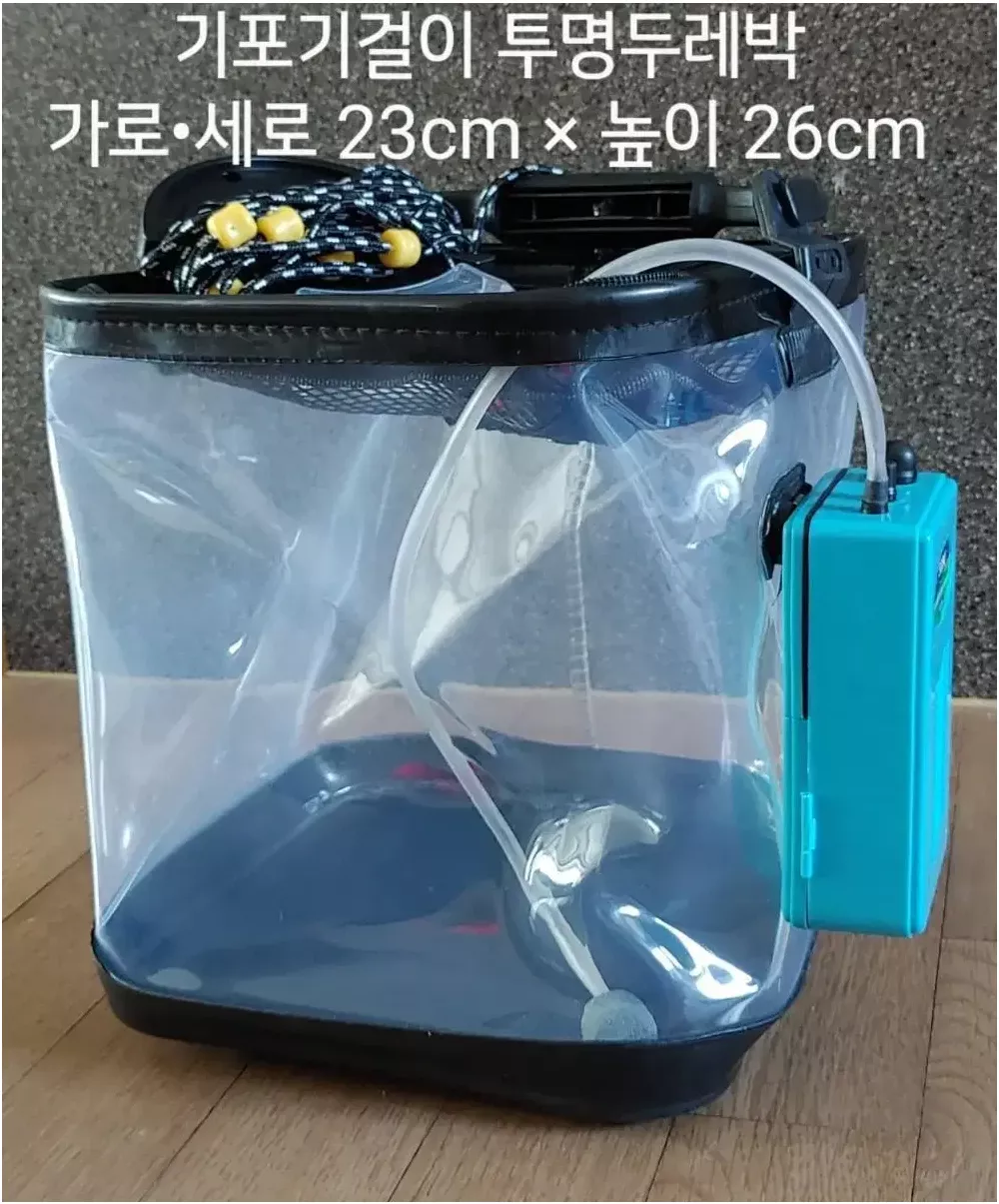 <투명대형두레박+기포기+D건전지2알+실리콘 고기집게> ★기포기 걸수 있는 걸이가 있는 대형 투명두레박(가로23cm,세로23cm,높이26cm)입니다 두레박사이즈(가로23cm,세로23cm,높이26cm) 줄 길이 6m(최장), 줄 60cm마다 손으로 당기기 편하게 고무구슬 박아 놨구요, 두레박 청소할수 있게 솔도 달려 있습니다 EVA(에바) 소재라 파손이나 깨질 염려가 없어 접어서 보관할 수 있기에 엄청 편합니다, 캠핑,낚시 필수용품입니다 투명 두레박이라 고기 헤엄치는거 다 보여서 특히, 애들이 엄청 좋아합니다 (일반두레박은 크기가 작아서 고기가 헤엄치지 못하고 기포기 걸이가 없음) 기포기 상태는 아주 좋습니다, 제가 계속 사용하고 있는데 고기가 밖으로 튀어나올 정도로 쌩쌩 돌아갑니다, 이틀 밤새도록 돌려도 작동하니 건전지 걱정은 안하셔도 됩니다(건전지 1알 넣어도 돌아가는 직렬방식입니다) ★두레박, 직접 주문 제작한 것이라 시중에 없는 겁니다 ★고기집게는, 두레박 옆에 놔두고 고기잡을때, 써보시면 손에 냄새도 안나고 장갑 안껴도 되고 진짜 엄청 편합니다