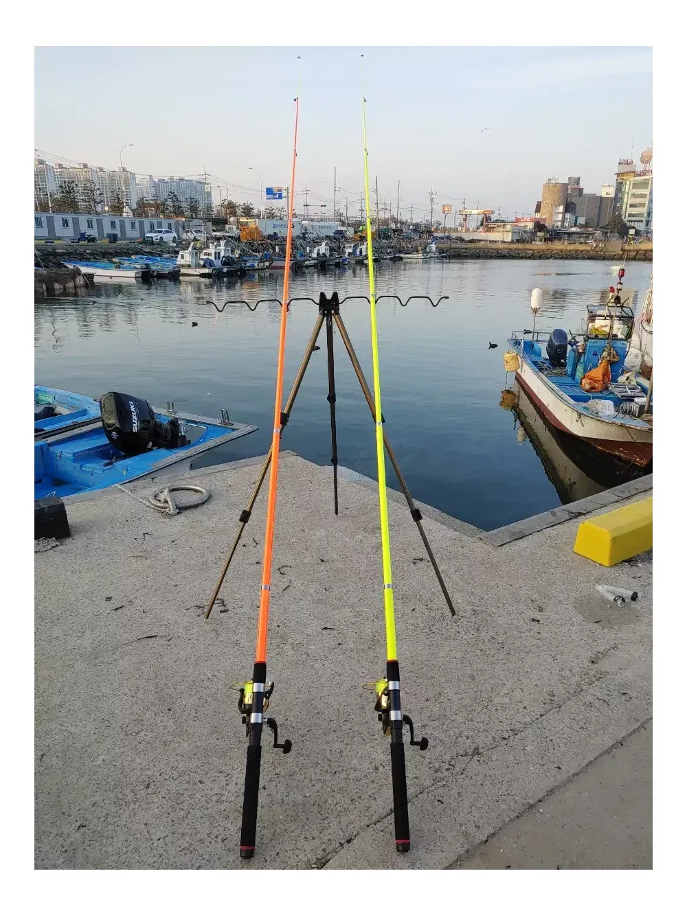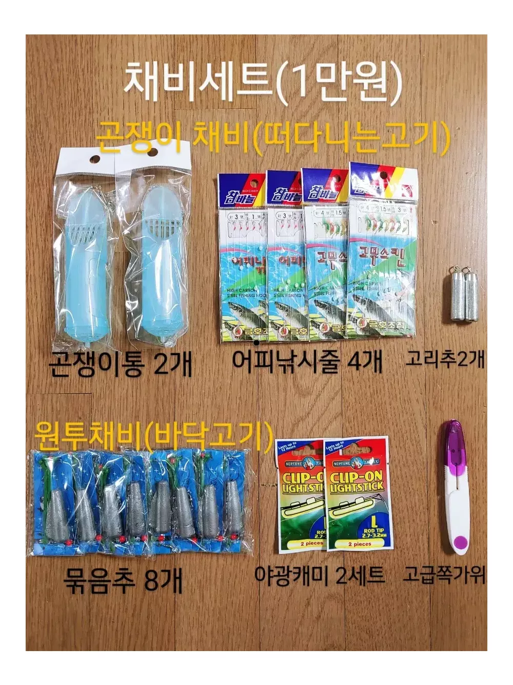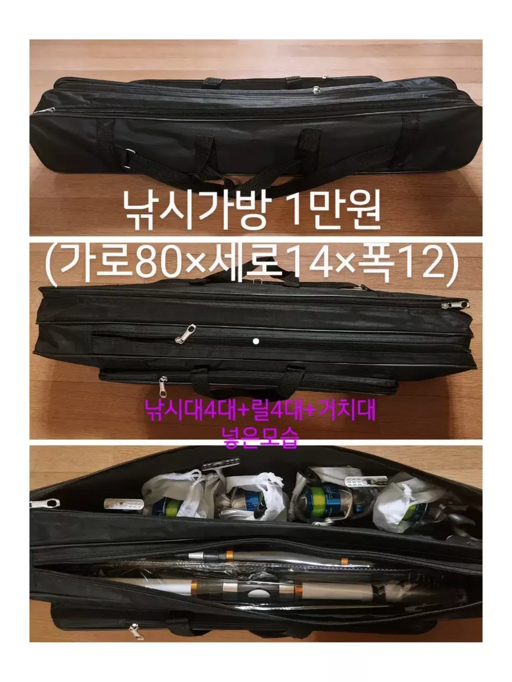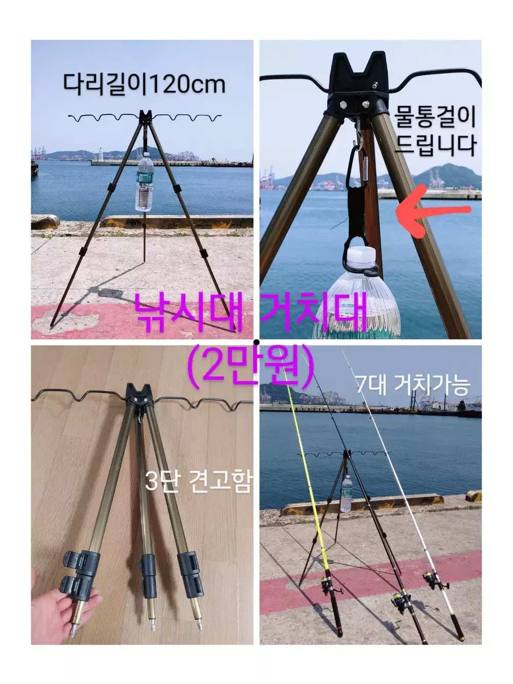 초보자, 입문용으로 가성비 좋은 낚시대입니다 막 사용하셔도 안부러집니다, 초보입문용으론 튼튼한게 최고입니다, 이걸로 1,2년 캐스팅 연습하시고 고가 낚시대로 갈아타심 됩니다 1. 낚시대 4대 색깔(노랑,주황,검정,흰색) 이쁘고 튼튼합니다 낚시대 길이 3.0m, 원투대 표준입니다 (4m이상 낚시대는 가격이 확 올라가서 비쌉니다) 직접 낚시대 강도 테스트 해봤는데 웬만해서는 안부러집니다, 고기 잡다가 부러질 일은 없습니다 2. 릴은, 실제 5000번입니다 4000번 보다 릴이 크고 튼튼합니다, 롤링도 훨씬 좋은 금속 릴입니다, 플라스틱 소재 아닙니다, 밤에도 잘보이게 형광색 낚시줄(5호줄) 쨍쨍하게 감아놔서 따로 줄 감을 필요도 없이 바로 사용 가능합니다 ※릴주머니 드립니다 [추가 낚시 필수장비] 3. 채비세트 ☞(1만원 추가) ※ 채비를 해야 고기를 잡을수 있어요 ☞곤쟁이통 2개+어피낚시줄 4개+고리추 2개 (물에 떠있는고기 공략)고등어,전갱이,놀래미 등 ☞묶음추 4개 + 4개(바닥에 다니는 고기 공략)광어 등 ☞야광캐미 2개 +2개 (야간 낚시때 낚시대 끝부분 보기위해 사용) ☞고급 쪽가위 (낚시줄 끊을때 필수입니다) 4.에기세트(에기7개+양면태클박스) - 1만원추가 문어,낙지,갑오징어 잡을때 사용하는 고기모양의 미끼입니다 색깔 다르게 7개에 보관하기 쉽게 양면태클박스 까지 드립니다 양면 태클박스에 에기 14개 들어갑니다 에기보관 이걸로 끝입니다 5. 살림망 구성품(1만원 추가) ☞살림망(고기담는 그물망) ☞어신감지기(고기가 걸리면 소리 남) ☞핀온릴+라인커터(당겨쓰는 낚시줄커터기) ☞실리콘고기집게(고기잡는 손집게) ☞묶음추 4개(바닥고기 잡는 바늘채비) 6. 낚시의자, 특대 ☞(1만5천원 추가) 팔걸이 있음 낚시의자 필수입니다 계속 서서 낚시 못합니다 사이즈 크고 튼튼합니다 팔걸이에 음료거치대도 있어서 편하게 오래동안 낚시 할수 있습니다 7. 낚시 가방(가로70cm×세로14cm×폭12cm) ☞ (1만원 추가) 낚시대 4대, 릴 4대, 거치대 딱 들어가는 크기로 사이즈 정말 좋습니다, 외부 포켓 하나 더 달려 있어서 잡다한거도 더 넣을 수 있습니다, 이 가방 하나로 낚시용품 깔끔하게 정리됩니다 8. 고급 3단 거치대+물통걸이 ☞ (2만원 추가) 낚시 거치대 필수이고, 엄청 편합니다 낚시대 7대 거치 가능하고 3단 펼치면 110cm로 길어집니다 다리 연결부위 쉽게 조작할 수 있고, 금속재질이라 아주 튼튼하고 견고합니다 거치대 균형잡을수 있게 물통걸이 같이 드립니다 물통걸이에 생수통 달아서 거치대에 매달아 놓으면 무게추 역할 하기에 아무리 바람 세게 불어도 쓰러지지 않습니다 (거치대 무게추 따로 사실려면 2만원 합니다 비싸요) 9. 기포기+투명(대형)두레박+D건전지2알☞3만추가 (EVA소재, 가로,세로×23cm, 높이26cm) 기포기 상태 아주 좋습니다 고기 쌩쌩하게 24시간 이상 살립니다,기포기 끄지 않으면 고기 안 죽습니다 D건전지(2알) 같이드립니다 2틀 밤새 틀어놔도 돌아갑니다, 1알로도 돌아가는 직렬방식입니다, (충전식 기포기는 비싸고 기포가 약합니다)