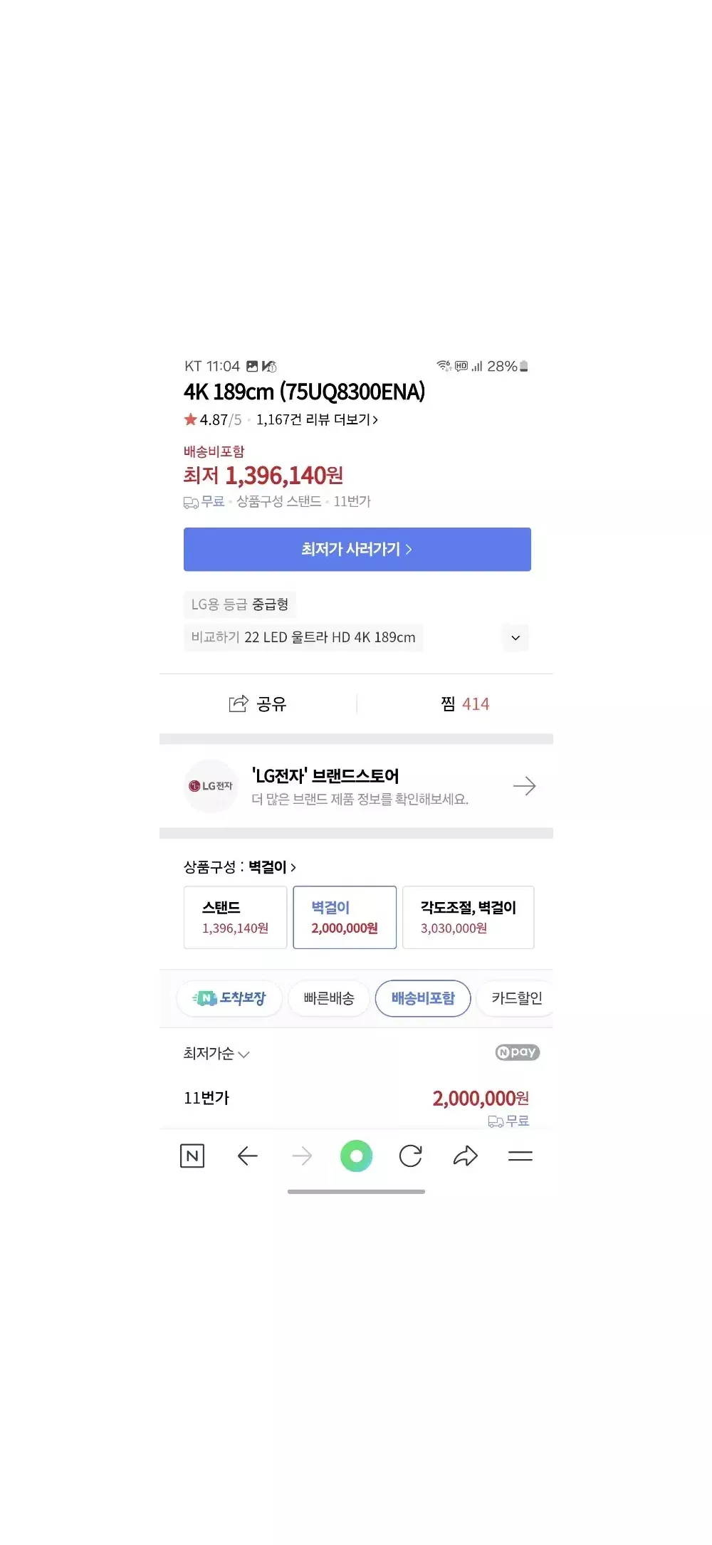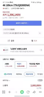 상품명 : 75UQ8300ENA 지역 : 인천광역시 남동구 간석동 구매시기 : 2023.04 판매금액 : 110만(배송비 미포함) 현재 최저가 : 200만 하자여부 : 일절 하자 없습니다. *배송비는 구매자 부담 그 외 궁금한 점은 연락주시면 답장드리겠습니다.