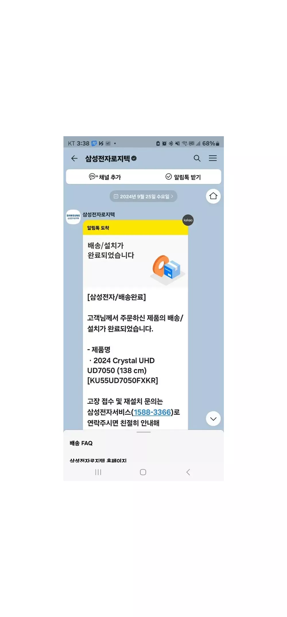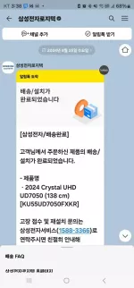 제품 배송 후, 이상유무 테스트만 했던 삼성전자 2024 LED CRYSTAL UHD 4K UD7050 138CM 55인치 TV 입니다. - 모델명 : KU55UD7050FXKR ※ 전자제품 특성으로 직거래만 하겠습니다. 자세한 상품 설명은 아래 링크 참조하시구요! https://msearch.shopping.naver.com/catalog/46405748621?NaPm=ct%3Dm1hajigw%7Cci%3D81591c86ae81ec85bf0c6eb484c45ce889ed3e3b%7Ctr%3Dsls%7Csn%3D95694%7Chk%3Da6171f63185f5118c2ad4cee0316937b01cdbad9&cat_id=50002114&deliveryCharge=true&frm=MOSCMOD&isOfficialOrCerti=false&purchaseConditionSequence=20174442&query=KU55UD7050FXKR&sort=LOW_PRICE