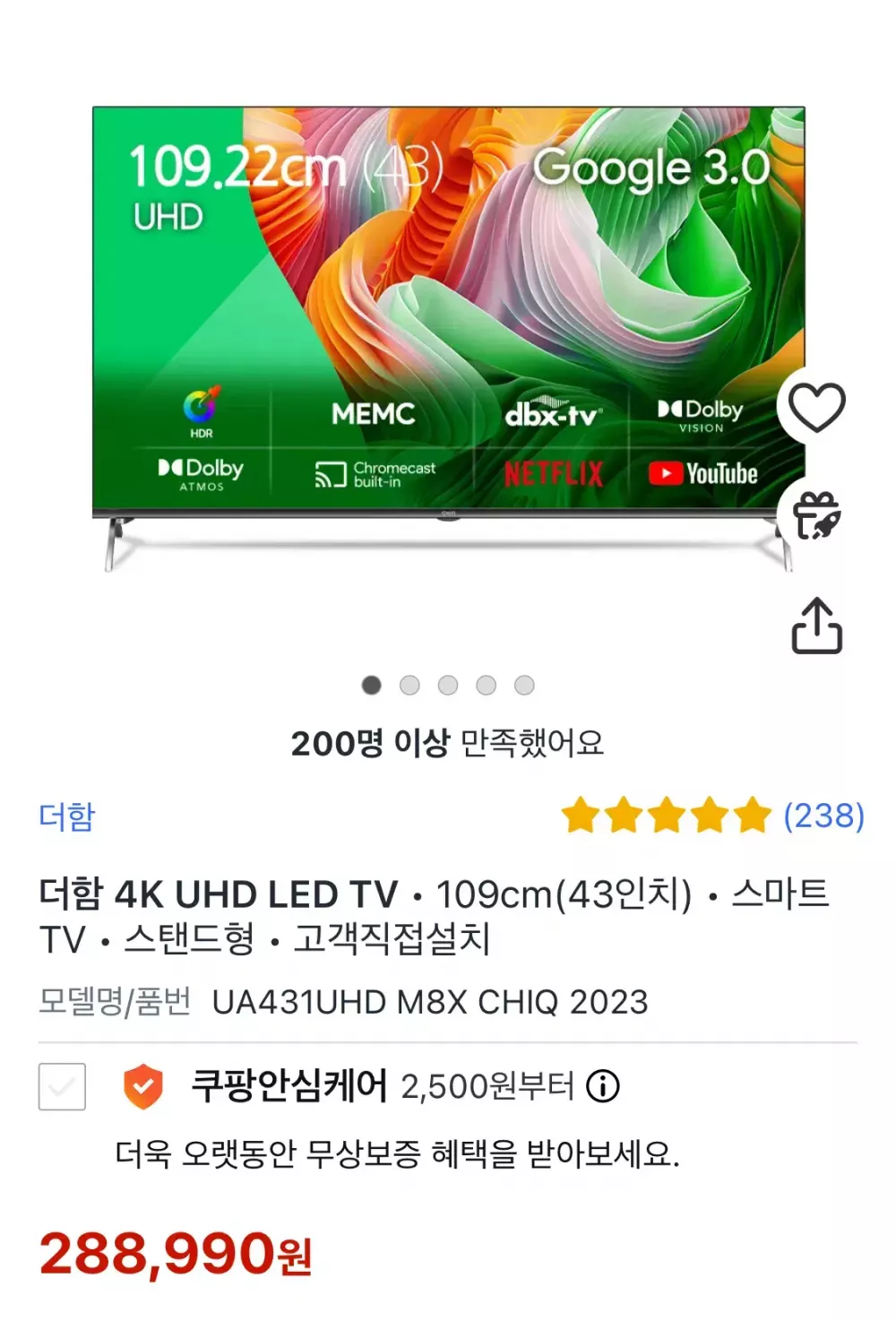 8/1에 쿠팡에서 산 더함 치크(chiq) 43인치 팝니다. 2주 정도 쓰고 박스에 넣어두었습니다. UA431UHD M8X CHIQ 2023 모델입니다. 수원에서 직거래 합니다~