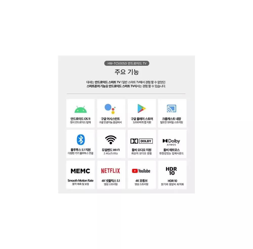 하이메이드 모델명 HM-TC500SD 작년에 하이마트에서 50만원대에 구매했고 사용감이나 하자 없습니다. (리모콘, 사용설명서 포함) 유튜브, 넷플릭스, 블루투스 호환됩니다. 직거래, 택배 가능합니다.