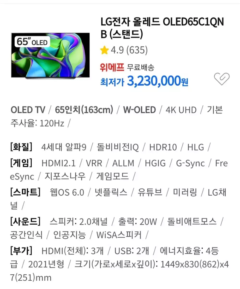 LG 올레드 65인치 4K UHD 스마트 TV 모델명 OLED65C1QNB 2021년 12월 국내 정품 모델이고 사용시간 약 1600 시간으로 짧은 제품입니다. 스탠드(미개봉사제품) 정품 각도 조절 벽걸이 브라켓 둘 다 드립니다. 음성 인식 신형 매직 리모컨도 포함입니다. 넷플릭스, 유튜브, 와챠, 디즈니+ , 애플TV, 쿠팡플레이 등 가능한 스마트 TV입니다. 안드로이드 및 아이폰 미러링 가능합니다. 서울 강동구 성내동입니다. 가까운 지역은 배송해드립니다. OLED TV/65인치(163cm)/W-OLED/4K UHD/기본주사율: 120Hz/ [화질] 4세대 알파9/돌비비전IQ/HDR10/HLG/ [게임] HDMI2.1/VRR/ALLM/HGIG/G-Sync/FreeSync/지포스나우/게임모드/ [스마트] 웹OS 6.0/넷플릭스/유튜브/미러링/LG채널/ [사운드] 스피커: 2.0채널/출력: 20W/돌비애트모스/공간인식/인공지능/WiSA스피커/ [부가] HDMI(전체): 3개/USB: 2개/에너지효율: 4등급/2021년형/크기(가로x세로x깊이): 1449x830(862)x47(251)mm