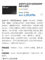 삼성 QLED 55인치 4K UHD 스마트 TV 모델명 KQ55QA60AFXKR 2021년 7월 제조 국내정품입니다. 삼성전자에서 액정 신품 교환해서, 2024년 12월 30일까지 무상패널 보증가능합니다. 전면, 베젤에 보호비닐 새것처럼 부착되어 있어요. 넷플릭스, 디즈니, 유투브, 왓챠, 티빙, 웨이브, 아이폰 미러링, TV PLUS 등 모두 지원됩니다 스탠드형(신품) , 벽걸이형 선택 가능합니다. 태양광 충전식 스마트 리모컨 포함입니다. 서울 강동구 성내동입니다. 가까운 지역은 배송해드립니다. QLED TV/55인치(138cm)/QLED/4K UHD/IPS패널계열/60Hz/슈프림UHD디밍/4K업스케일링/모션보간(MEMC)/필름메이커모드/화면반사방지/프로세서: 퀀텀4K Lite/스마트: 넷플릭스, 유튜브, 미러링, 음성인식, 삼성TV플러스/OS: 타이젠/사운드: 돌비디지털, 인공지능, 블루투스오디오, 사운드바동시출력/HDMI(전체): 3개/USB: 2개/Wi-Fi/Wi-Fi다이렉트/LAN/블루투스/옵티컬/에너지효율: 1등급/소비전력: 145W/2021년형/베사홀: 200x200mm/크기(가로x세로x깊이): 1232x709(748)x26(229)mm/스탠드너비: 904mm/ [화질음질] HDR10+/HLG/스피커: 2.0채널/출력: 20W/ [게임특화] ALLM/엑스박스클라우드/지포스나우/게임모드 / 출시가: 1,690,000원