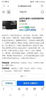 LG 55인치 올레드 4K 120Hz OLED 스마트 TV 모델명 OLED55B1FNA 2021년 12월 국내 정품 모델입니다. 2024년 3월까지 무상패널 보증 적용됩니다. 상태 S급 벽걸이형 입니다. 120Hz 스캔방식으로 화면의 움직임이 더 부드럽게 재생됩니다. 넷플릭스, 유튜브, 와챠, 디즈니+ , 애플TV, 쿠팡플레이 등 가능한 스마트 TV입니다. 안드로이드 및 아이폰 미러링 가능하고 응성인식, 구글어시스턴트 지원합니다. 음성인식 인공지능 매직리모컨 포함 서울 강동구 성내동입니다. 가까운 지역은 배송해드립니다. OLED TV/55인치(138cm)/W-OLED/4K UHD/4K주사율: 120Hz/픽셀디밍/4K업스케일링/장르맞춤화면/모션보간(MEMC)/필름메이커모드/프로세서: 4세대 알파7/스마트: 넷플릭스, 유튜브, 미러링, 구글어시스턴트, LG채널/OS: 웹OS 6.0/사운드: 돌비애트모스, 공간인식, 인공지능, 블루투스오디오, WiSA스피커/HDMI(전체): 3개/USB: 2개/지원: HDMI2.1, eARC/Wi-Fi/LAN/블루투스/옵티컬/에너지효율: 4등급/소비전력: 343W/2021년형/베사홀: 300x200mm/크기(가로x세로x깊이): 1228x706(744)x47(246)mm/스탠드너비: 559mm/ [화질음질] 돌비비전IQ/HDR10/HLG/스피커: 2.0채널/출력: 20W/ [게임특화] HDMI2.1/VRR/ALLM/HGIG/G-Sync/FreeSync/지포스나우/게임모드
